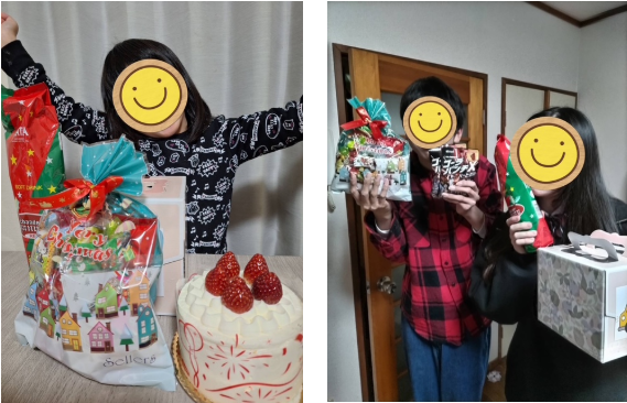 そんな切実な思いを受け、「せめてクリスマスだけでも特別な体験を届けたい」と、えんまるでは毎年ホールケーキの配布を続けています。 さらに今回は、サンクゼール財団の助成金で購入したシャンメリーもセットに添えられ、より一層クリスマスらしい、華やかな詰め合わせになっていました。